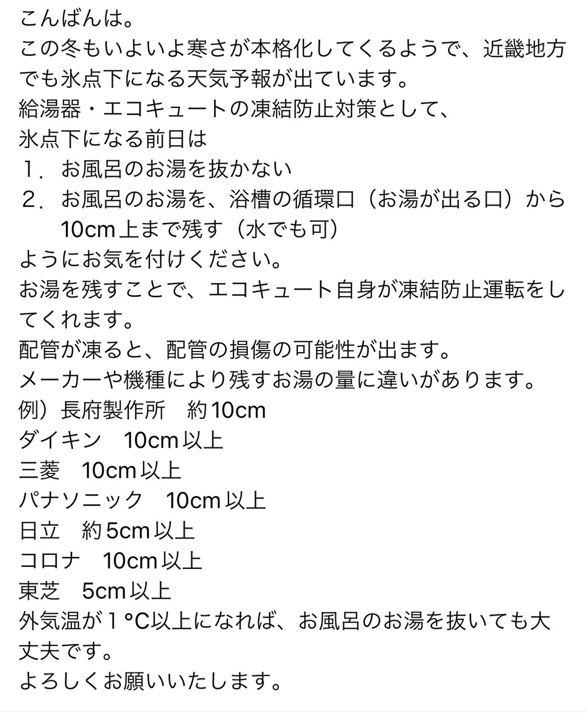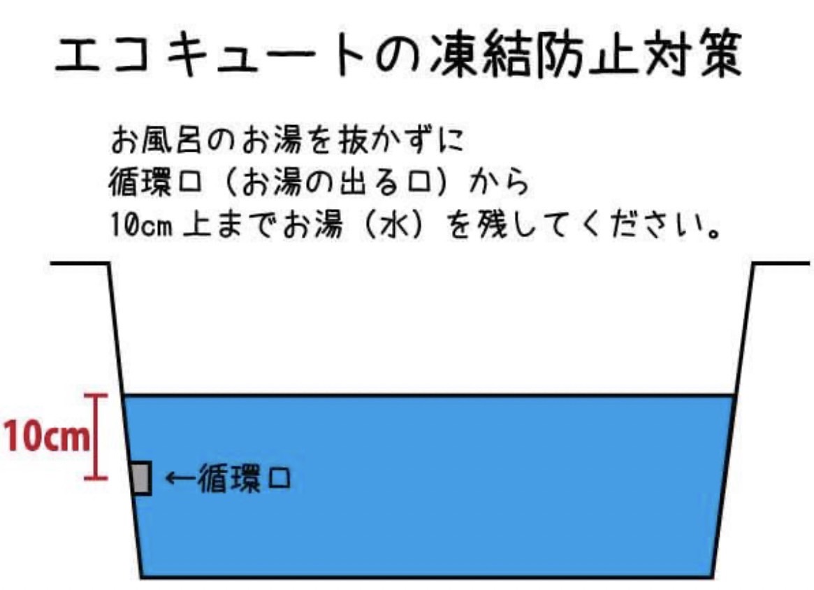 1.おふろの湯を抜かない 2.おふろの湯を、浴槽の循環口(お湯が出る口)から10㎝上まで残す。 (水でも可能です。) 配管が凍ると大変ですからね。