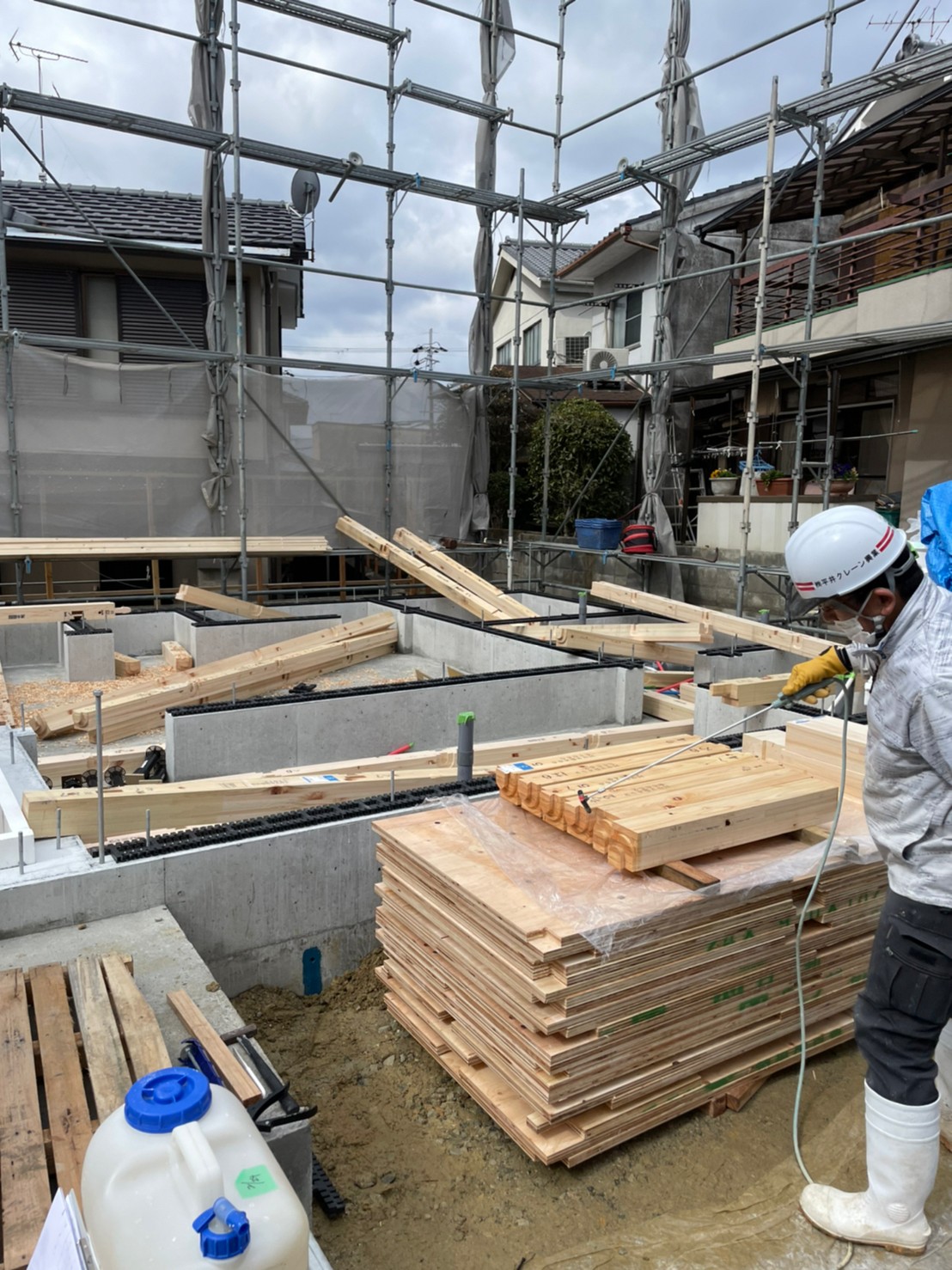 本日はHさま邸 建て替え工事 土台敷きでした。
