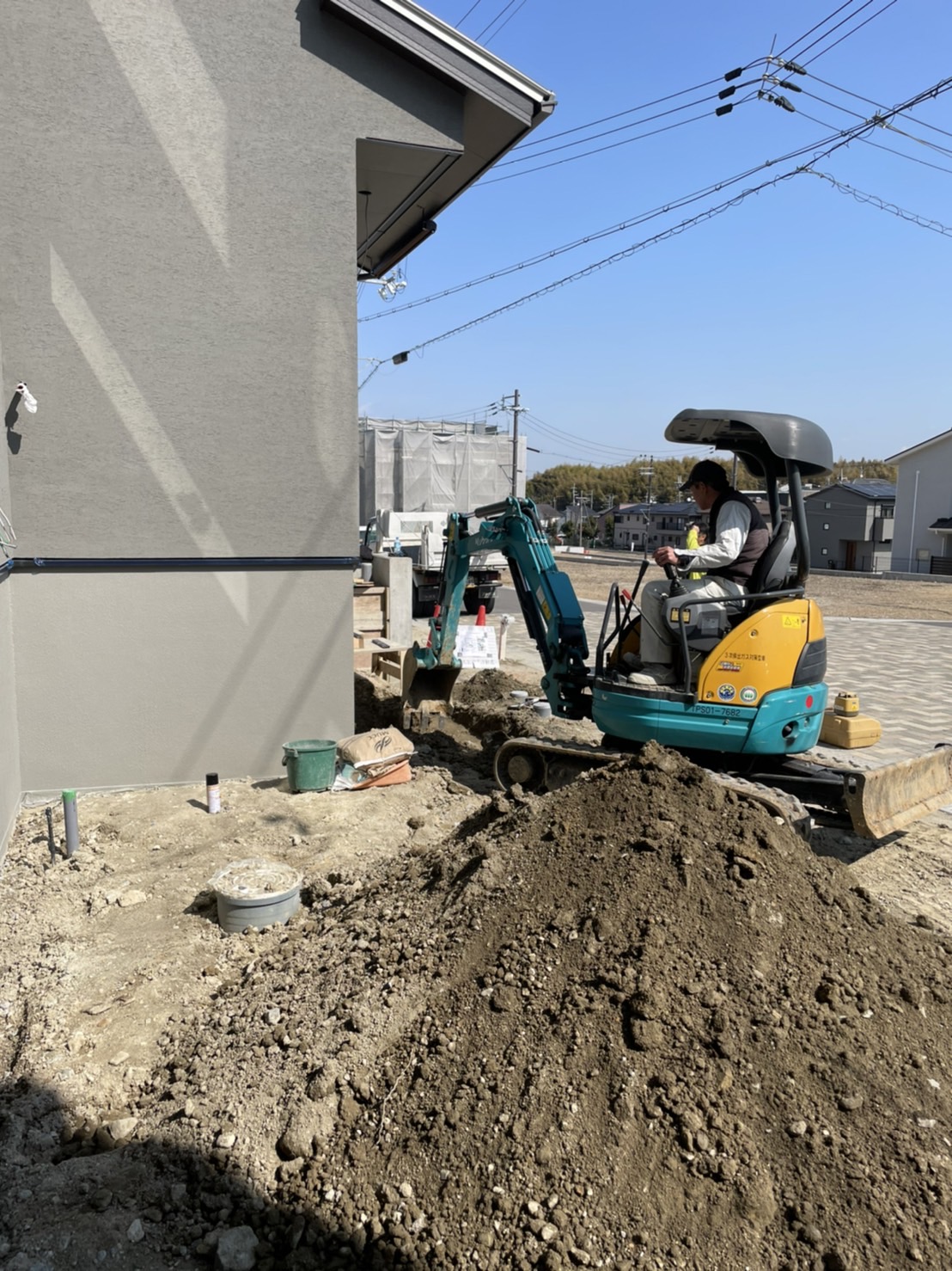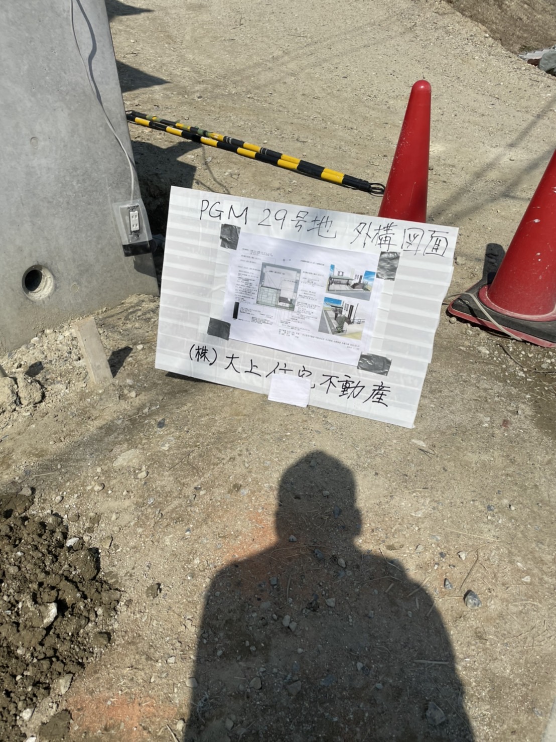 職人さんに見やすいようラミネートした外構図を現場に用意。