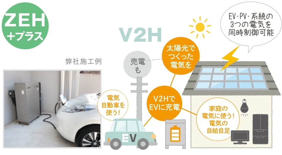 (オプション)PV(太陽光発電)からEV(電気自動車)の蓄電池に充電したり、電気自動車からエネルギーを家に供給できます。EV・PV・系統(電力会社からの電気)の3つの電気を同時制御、売電も可能です。
