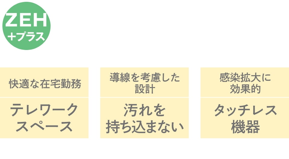 (オプション)テレワークなど、今までとは生活スタイルが変化し、家で過ごす時間が多くなるため、光熱費が増加傾向にあります。エネルギー消費をおさえるZEHはもちろん、テレワークや汚れを持ち込みにくい動線のプラン等、これからの暮らしに対応します。
