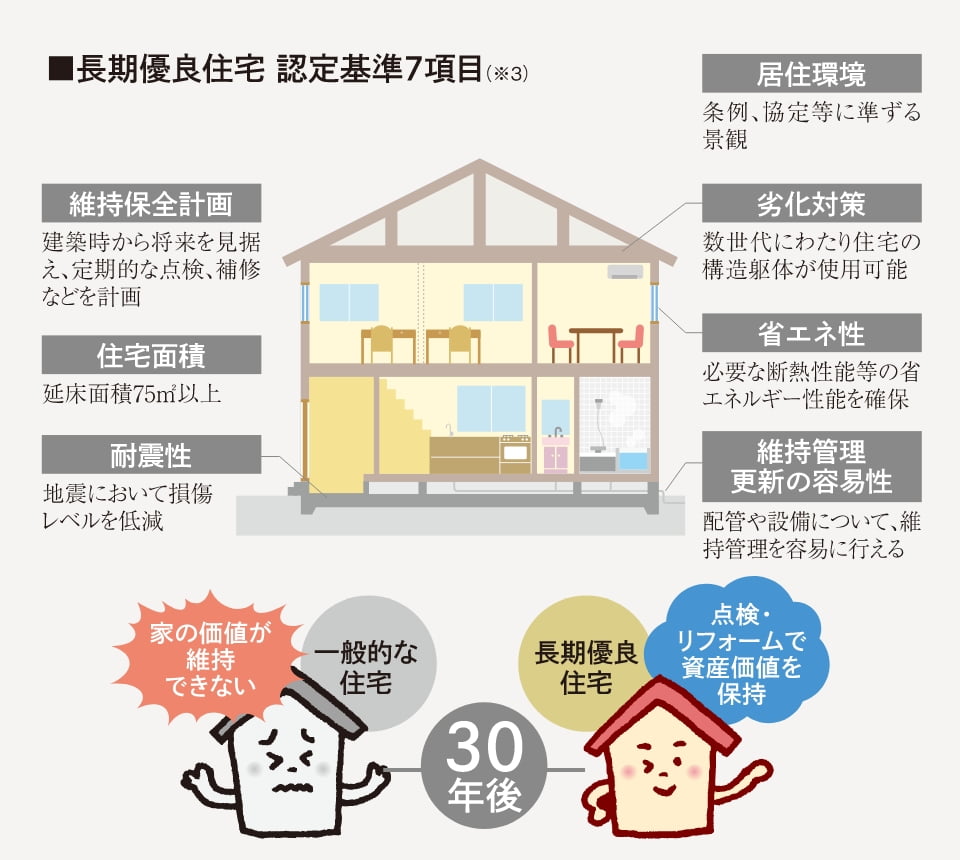 ※2 お客様のご希望される建築プランによっては、長期優良住宅の認定基準を満たさない場合があります。また、認定の申請は、着工前に行う必要があります。