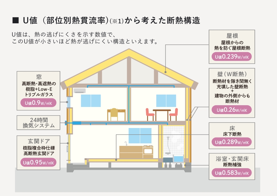 ※1 U値は熱の伝わりやすさを示す数値で、室内外の空気温度に1℃の差がある場合、1時間に1㎡あたりで通過する熱量の大きさを表しています。