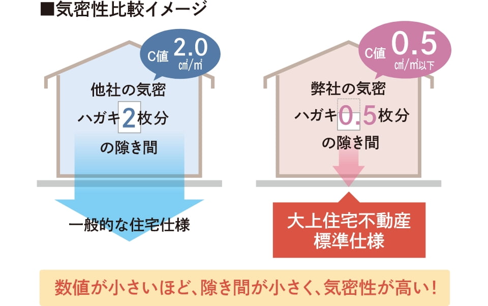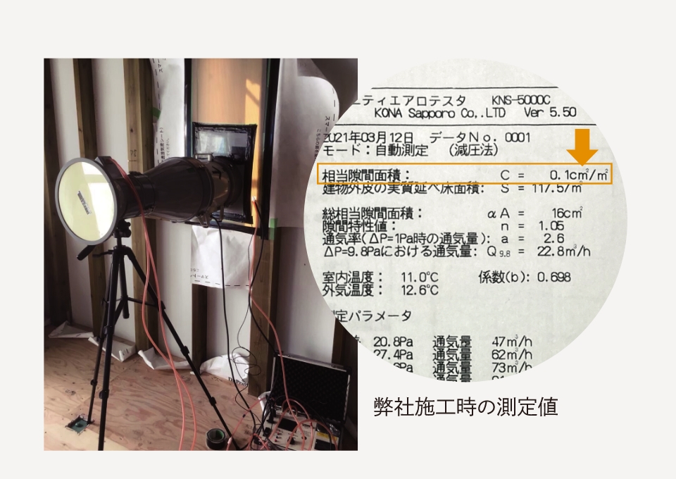 「相当隙間面積=C値」は住宅の気密性能を表す値で、値が小さいほど高気密な住宅です。計画的な換気のためには1.0㎠/㎡以下、家全体でハガキ1枚分以下の気密性が必要と言われております。現在の法令上、C値を計測する必要はありませんが、弊社では建築時に必ず計測し「C値0.5㎠/㎡以下」をお約束いたします。