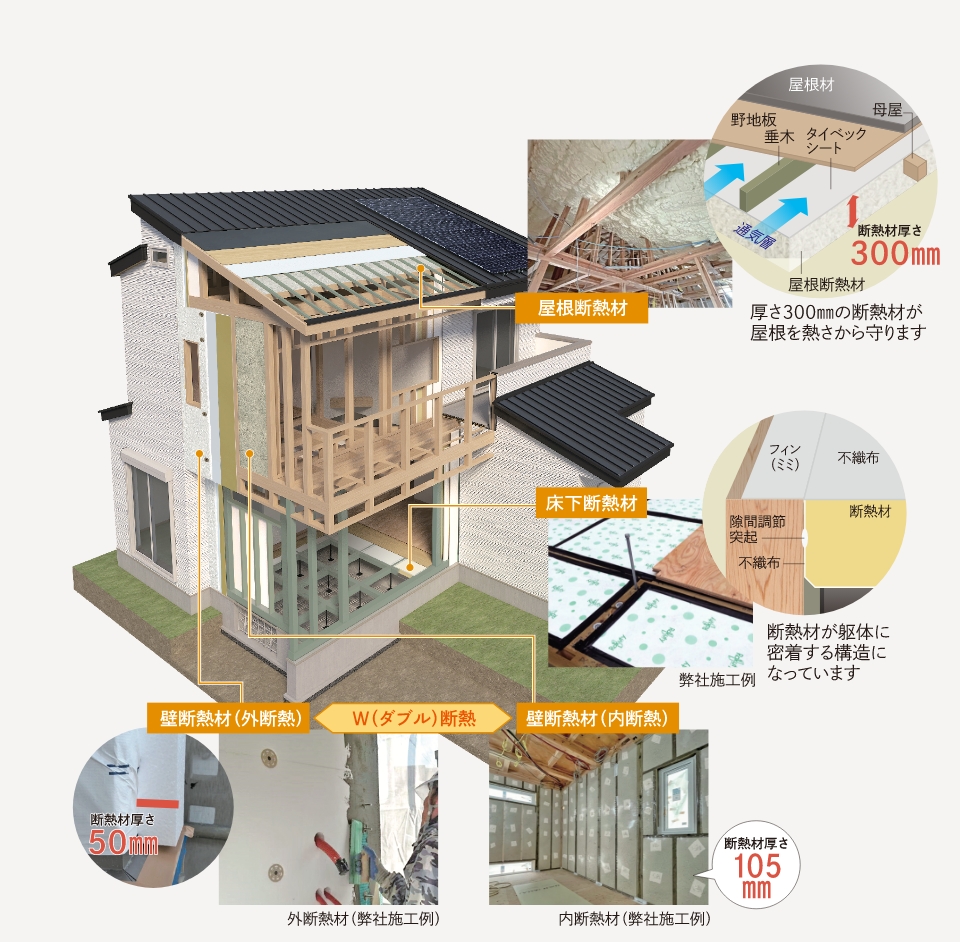 家の外と内からのダブルの断熱材が、家全体をすっぽりと包み込み、温熱環境と省エネルギー性を高め、良好な住環境を整えると共に、家自体の劣化をも防ぎます