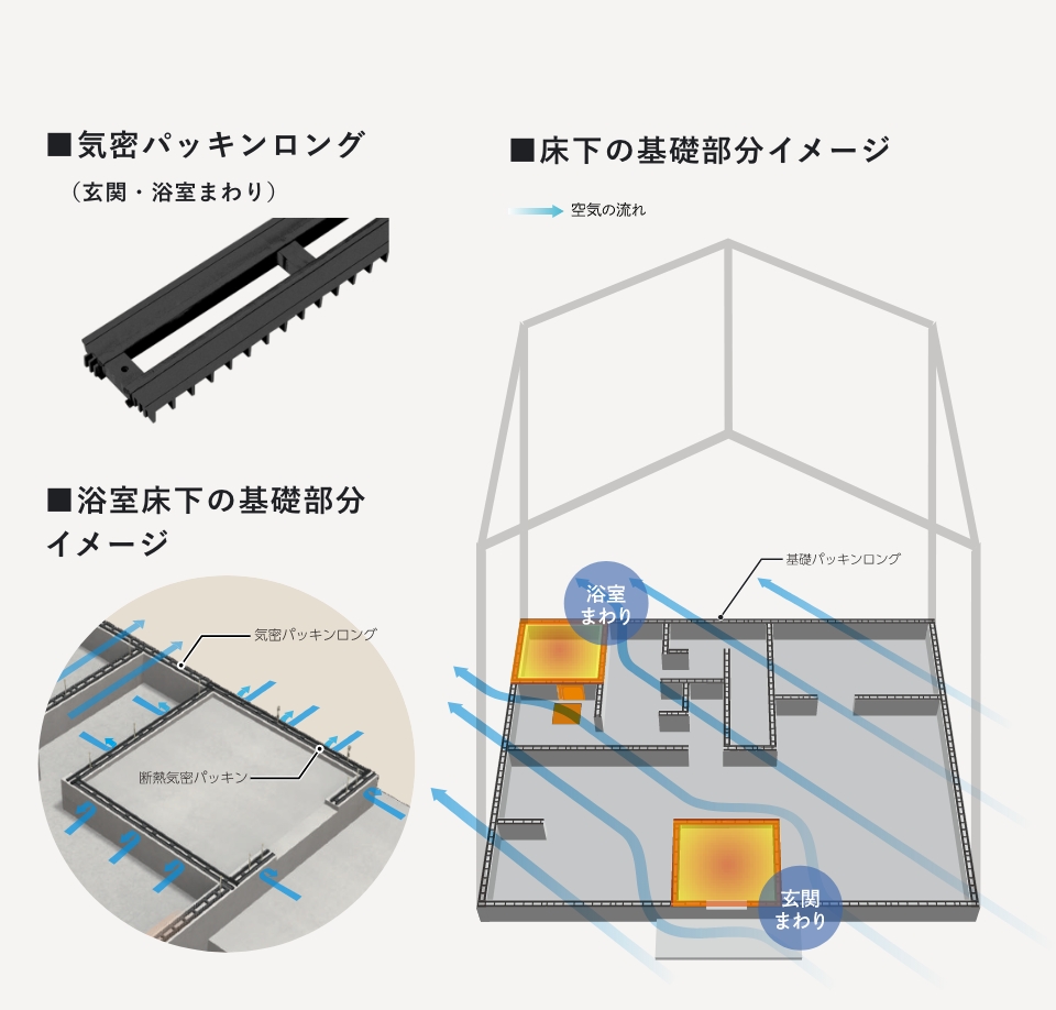 玄関・浴室まわりは、部材同士の見えない隙き間から冷気が流入しやすく、断熱性が損なわれがちになります。そこで、それぞれに合わせた気密パッキンを使用して気密をしっかりと保ち、快適な室温を保つ工夫をしています。