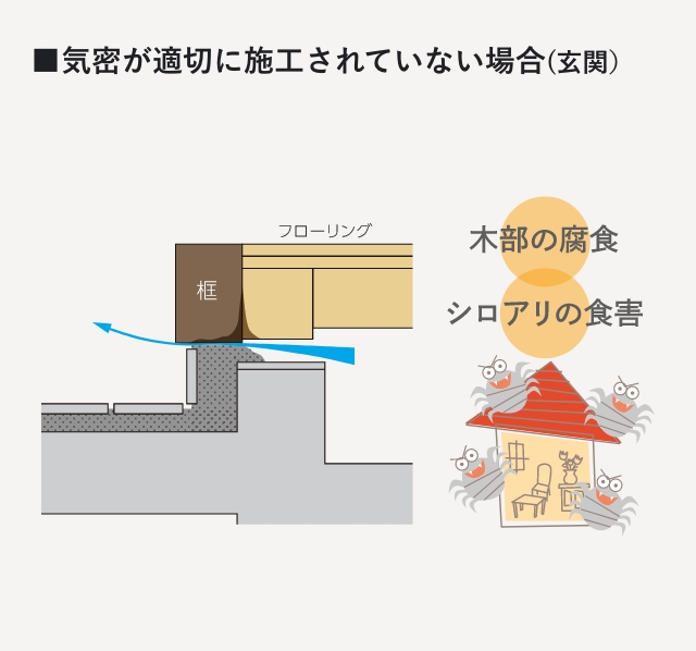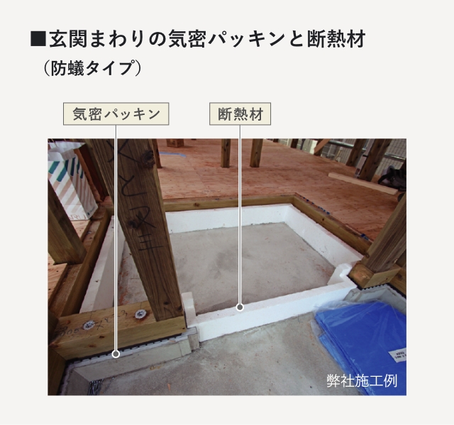 玄関まわりは、気密が不十分だと、框下の隙き間から床下へ冷えた空気が侵入してしまいます。 これにより、床下の湿気が框部分にたまり、木部の腐朽やシロアリの食害につながる可能性もあります。弊社では気密パッキンを使用して気密を保ち、さらに断熱材も併用して断熱性も高めています。