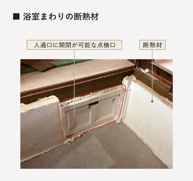 浴室まわりは床下の適切な施工に加えて、断熱材と気密パッキンで浴室内部を外気と接触させないようにしています。室温の低下による省エネ効果を下げないようにするだけでなく、ヒートショックなどの健康被害を防止します。