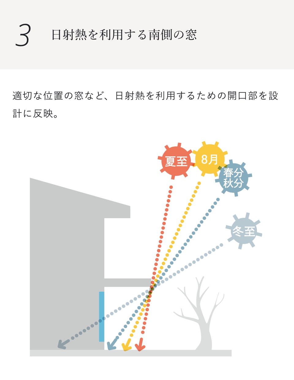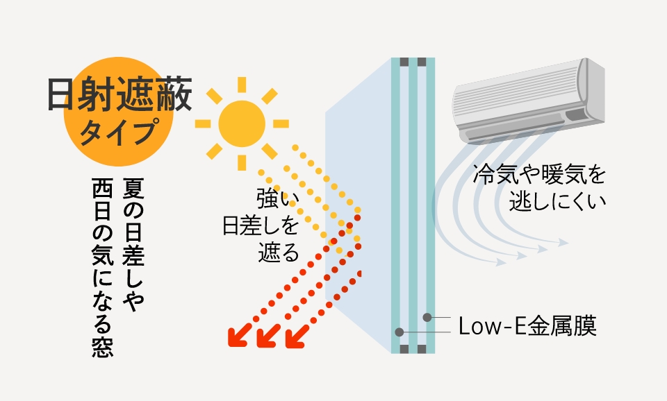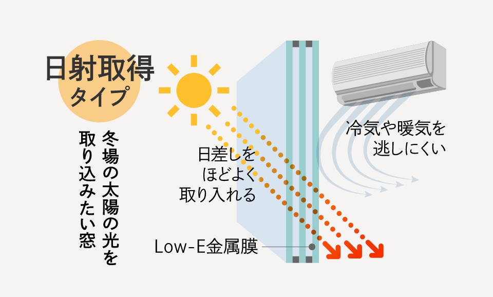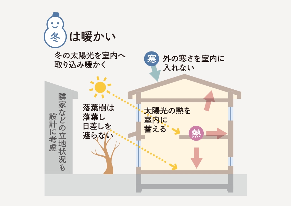 建物の熱の出入りの大半を占める開口部には、「日射取得タイプ」「日射遮蔽タイプ」の2種類のLow-E複層ガラスを採用し、窓の位置や方向によって使い分ける事で季節ごとに快適な室温を保ちます。