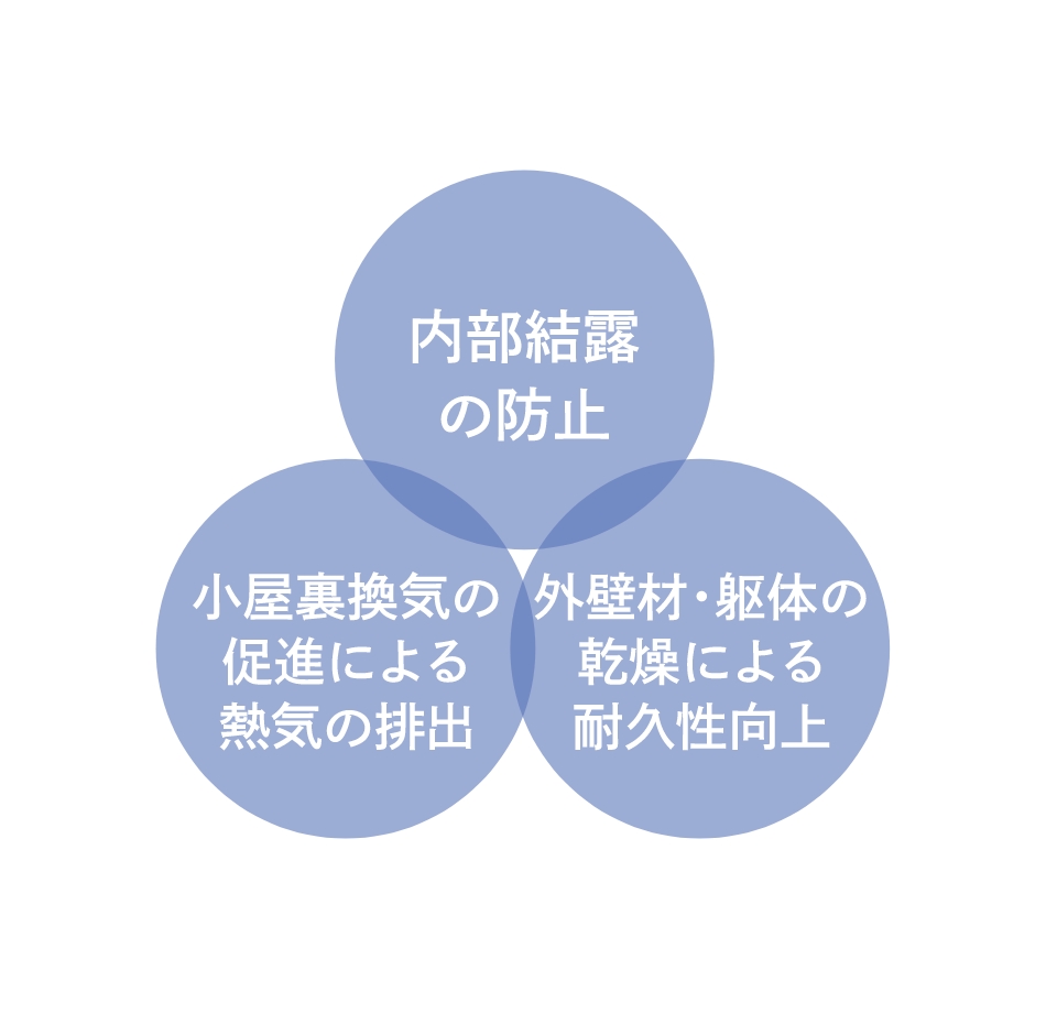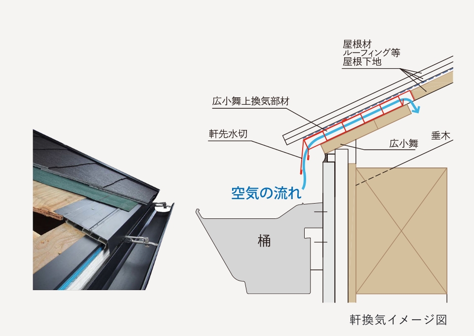 軒先に換気口を設け、通風を確保。夏の温度上昇や冬の結露を防ぎます。