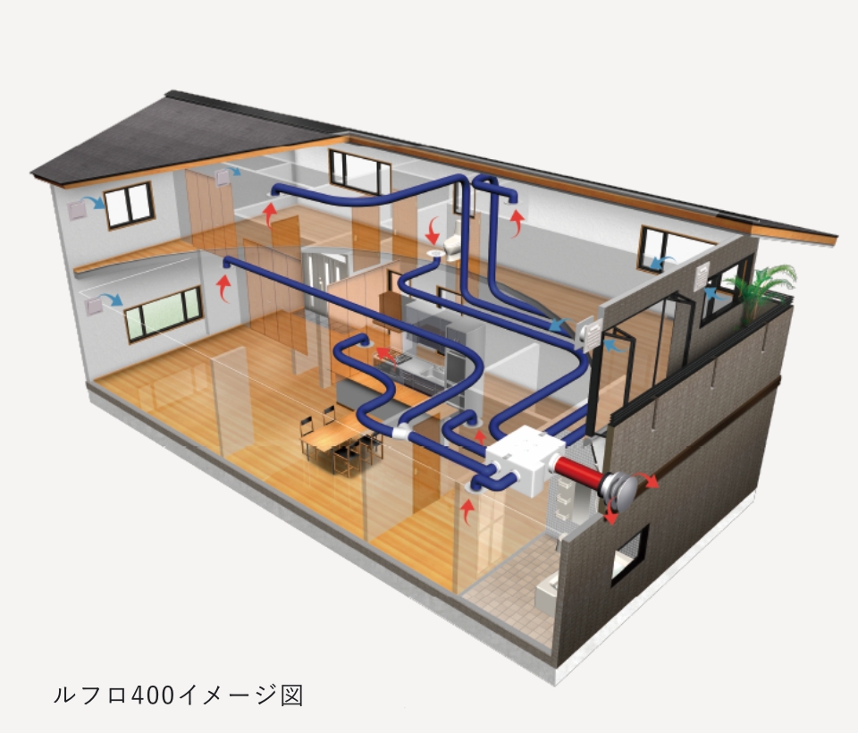 日々の健康は、適切な換気から生まれる新鮮で清潔な空気から。かの有名なナイチンゲールも看護において新鮮で清浄な空気の必要性を自著で挙げています(※1)。弊社では、これを実現するために、比較的ランニングコストが安く、手入れも簡単なダクト式の第3種換気システム「ルフロ400」を採用しております。