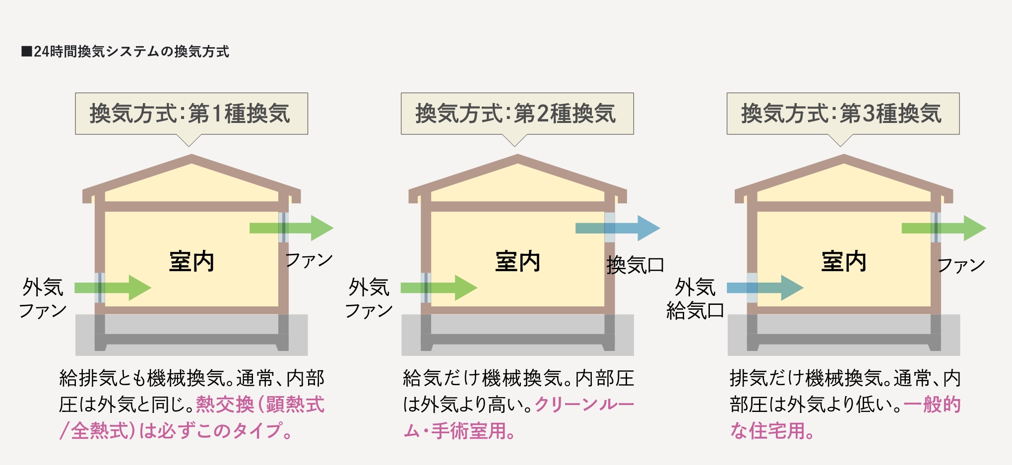 換気システムの換気方式は、主に3種類。 住宅用では第1種換気方式と第3種換気方式が一般的です。弊社では「ルフロ400」を標準で採用しておりますが、排気する熱を再利用することで、冷暖房費を削減できる「熱交換(顕熱式/全熱式)換気システム」や設計段階で建物全体の空調効率を考慮して設置される第1種熱交換換気+「アメニティビルトインエアコン」等も、ご要望に合わせてご用意しておりますので、ご相談ください。