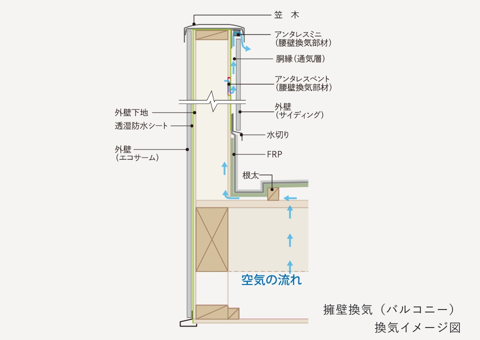 バルコニーのパラペット周りは、漏水や内部結露が起こりやすいため、空気を通すことで、胴縁と透湿防水シートに発生する腐食菌を防ぎます。