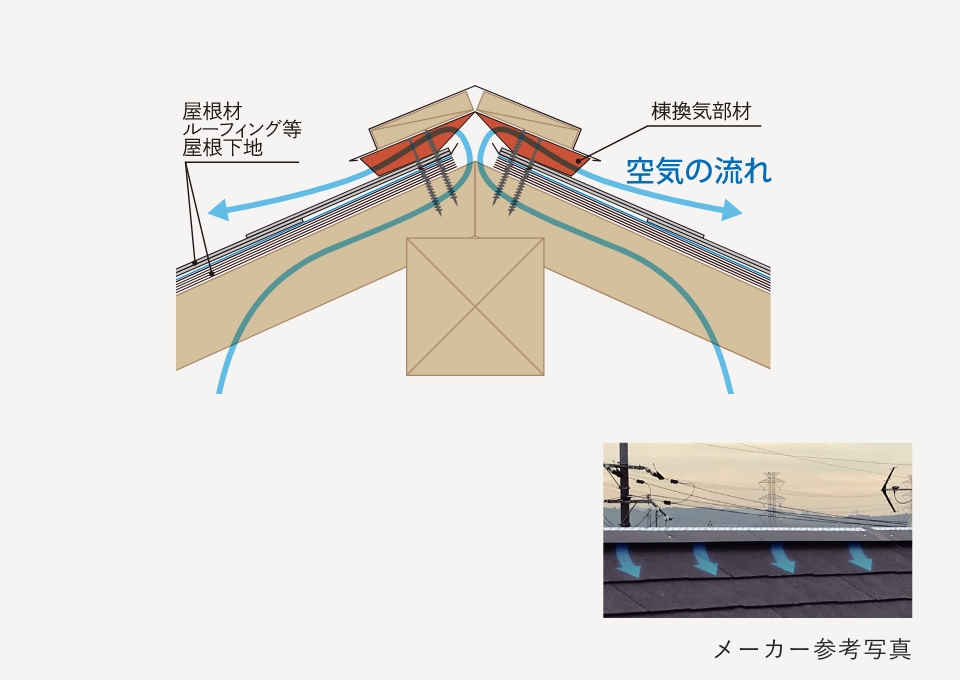 小屋裏(屋根裏)の湿気や熱気を排出する為に、屋根の棟部に設けた換気部材です。垂木間ごとに通気経路を設け、連通性を確保しています。