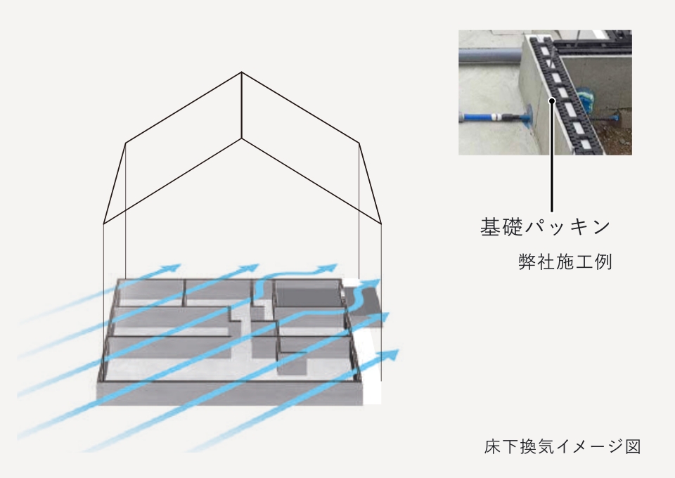 基礎と土台の間に基礎パッキンや基礎パッキンロングを敷き、自然の気流で床下全周換気を促すと同時に、基礎と土台を絶縁し、湿気が土台に上がることを防ぎます。