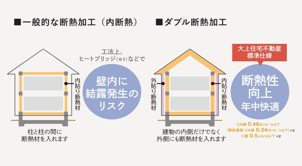 ※1 断熱材が入っていない躯体部分(柱や梁)を通じて、屋外の熱(冷え)を内部に伝える現象のこと。