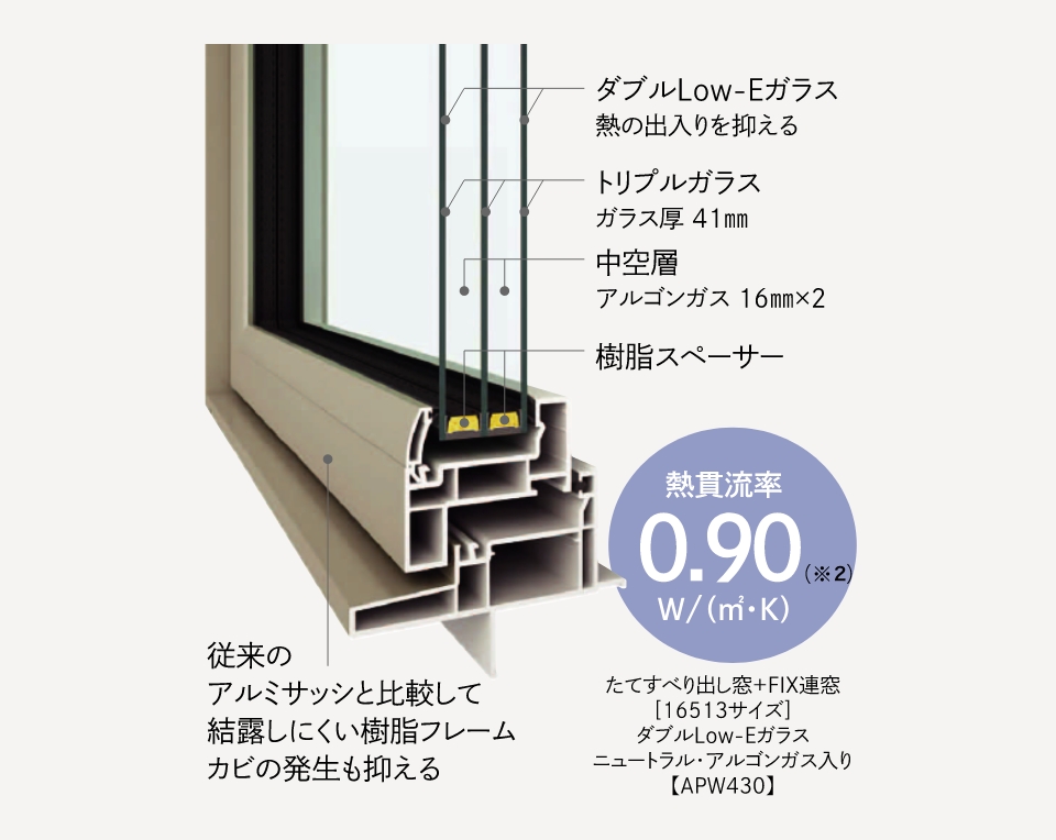 熱の出入りを抑える高性能トリプルガラス仕様の断熱性が高いい樹脂フレームで、ガラスまわりの防露性がより向上する樹脂スペーサーとアルゴンガス入りタイプを標準採用しました。