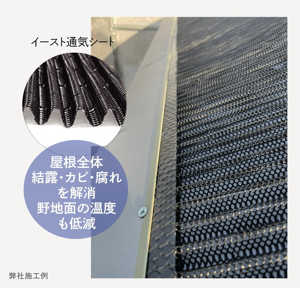 通気層保持部材には様々の種類があります。屋根に使用する「イースト通気シート」のように、換気・湿気・通気・耐水等の多機能を持つものも対応可能です。