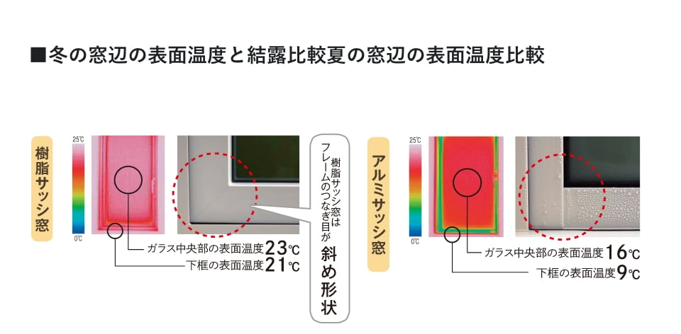 試験画像:室外温度0℃/室内温度24℃実験値)、住結露画像:室外温度0℃/室内温度20℃/相対湿度60%樹脂サッシ窓APW430(日射遮断型)使用