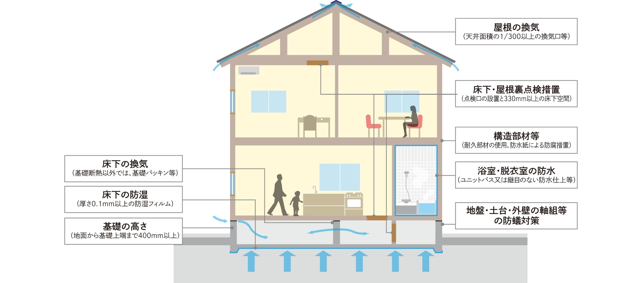 木造住宅なら構造躯体である土台や柱の腐食対策が大切です。通常で想定される条件下で、100年程度の耐久性が求められます。例えば、床下と小屋裏の点検口を設置し、床下空間は一定の高さ(330㎜以上)を確保すること等、長期優良住宅の認定基準で決められた仕様になっております。
