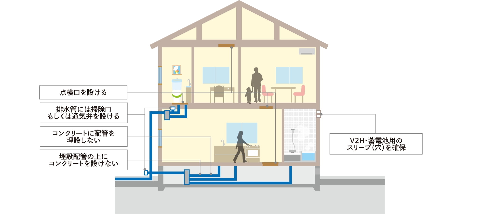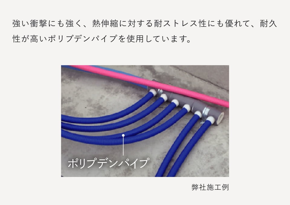 排水配管をコンクリートに埋め込まず、露出配管(ヘッダー式)にすることで、排水管の抜き差しも容易で、点検・補修がスムーズに行えます。