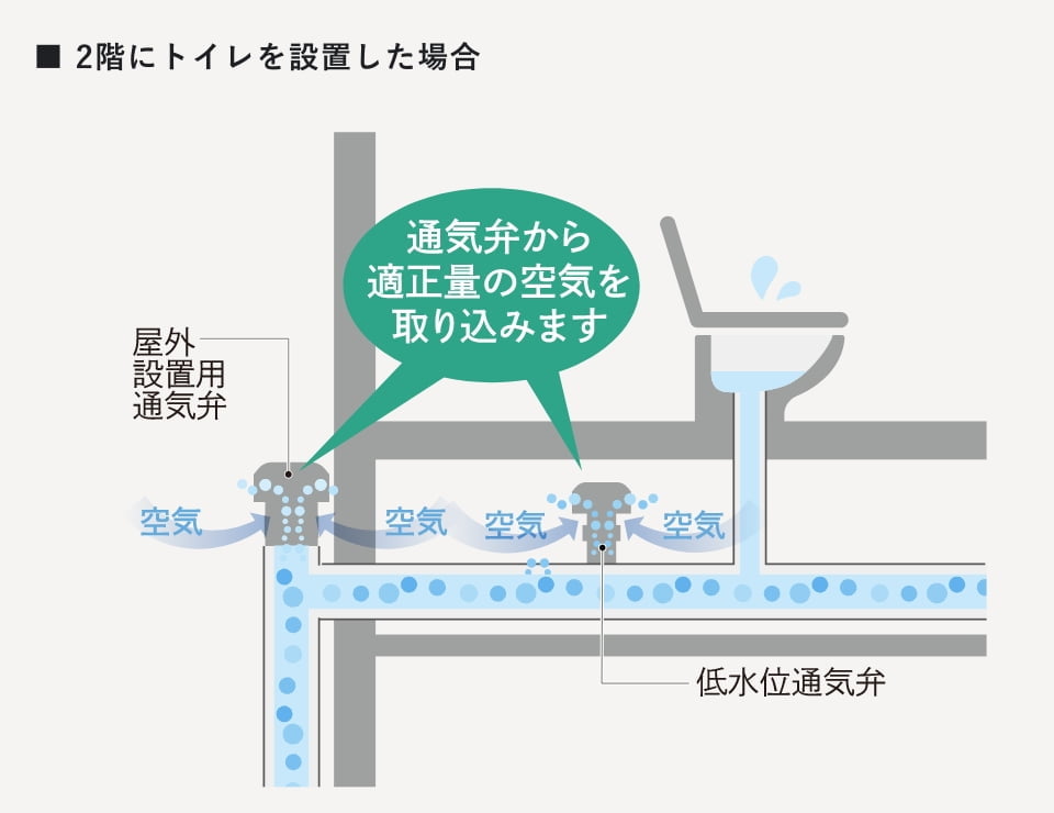 2階水廻りには床下空間で使用ができる低水位通気弁(ドルゴ通気弁)を採用しています。外壁が汚れる心配がなく、排水管の臭気対策にも有効です。 -