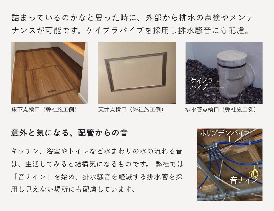 給排水管やガス管の設備配管の定期的な点検やメンテナンスするために、適切な点検口が必要です。弊社では、床下・天井に各2箇所以上設けています。また、床下には高気密高断熱型点検口を採用しております。