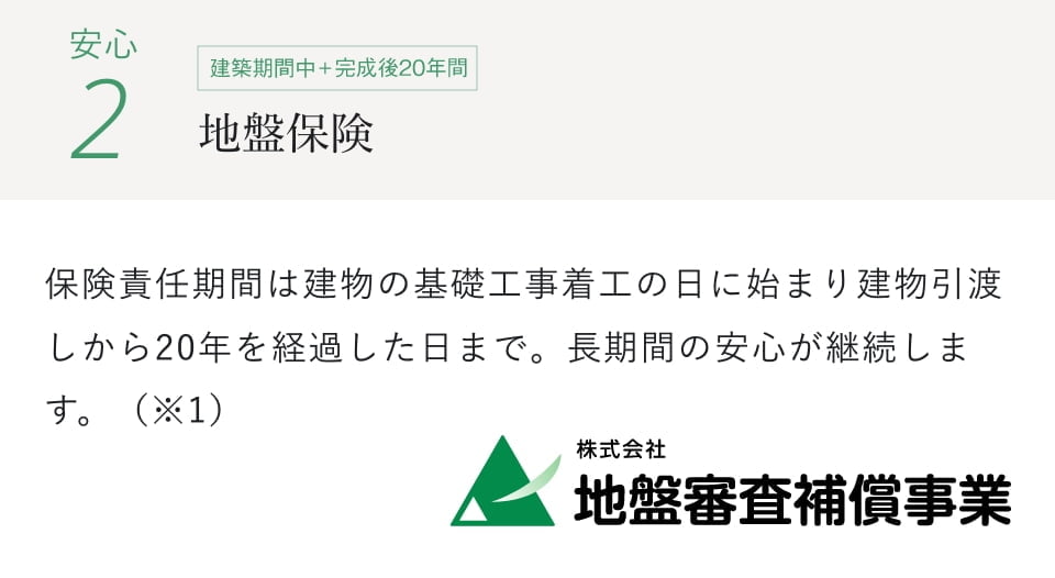 ※1 地盤審査補償事業による地盤審査完了日(補強工事が必要な場合は施工審査完了日)から1年以内に基礎工事着工が行われなかった物件や、建設工事完了の日から2年以内に引渡しの行われなかった物件は除きます。また、制度全体の保険期間(保険の契約期間)は22年間となっており、保険責任期間(基礎工事着工から建物引渡しの日)に対応した余裕のある保険期間が設定されております。