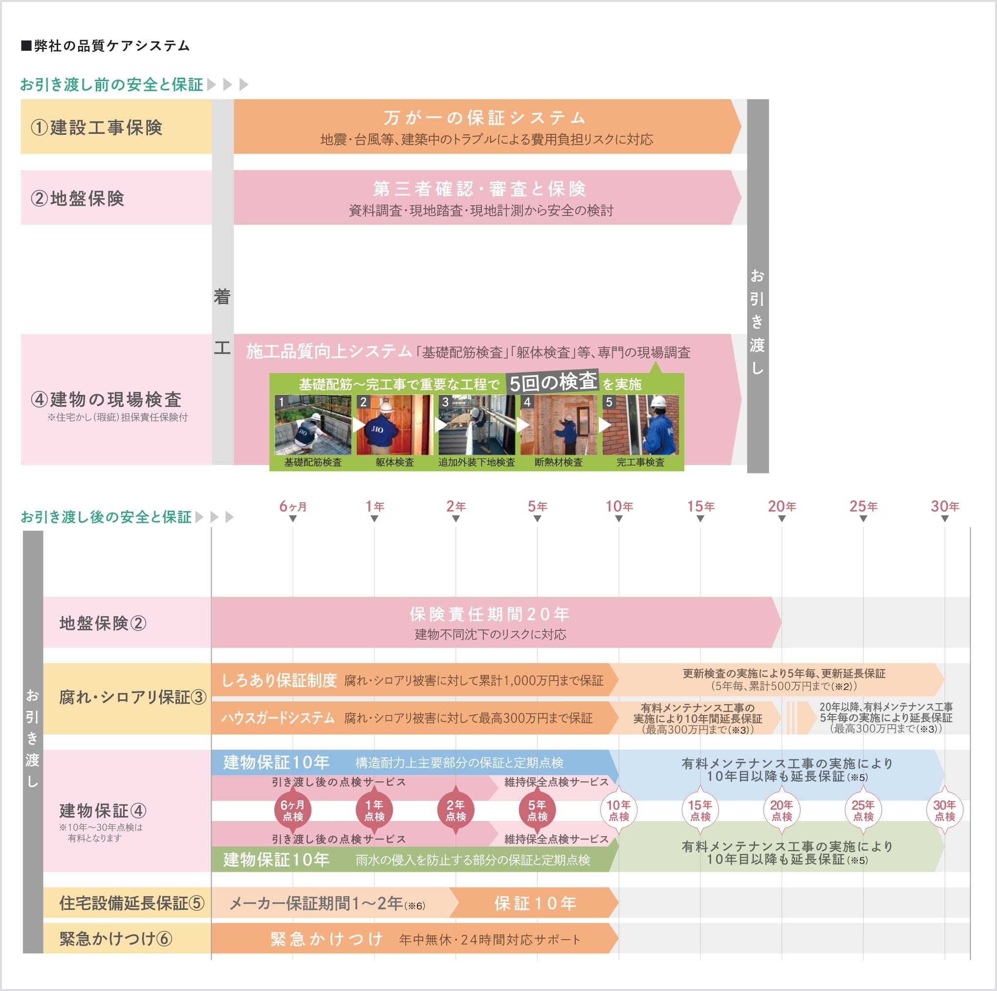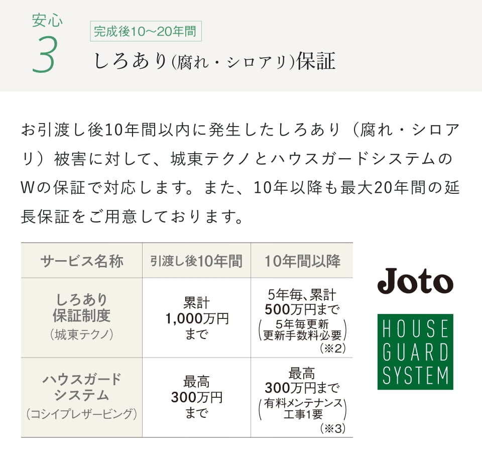 ※2 弊社標準仕様にて建築された場合に限ります。また、しろあり保証制度の延長(しろあり延長保証制度)は5年毎更新となり、更新毎の更新検査と更新料が必要です。(延長最長20年)