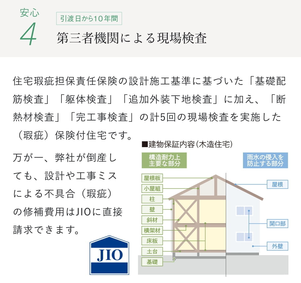 大事な住まいの状況を確認するために、定期的に点検を行なっております。 これは、安心の第三者機関によるもので、お引き渡し後6ヶ月・1年・2年・5年、 以降5年単位で行なっております。