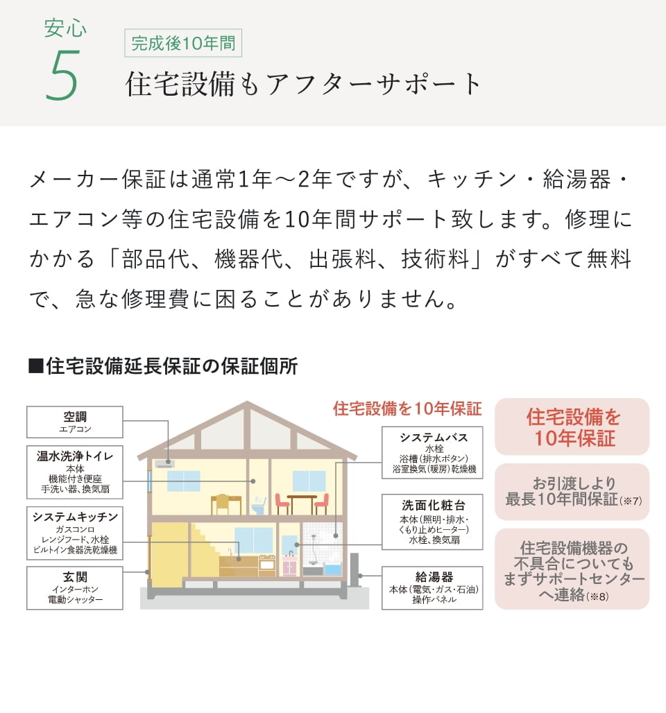 ※7 メーカー保証期間と合計10年の保証となります。また、設備延長保証サービス約款に記載の設備機器が対象となります。免責事項についても設備延長保証サービス約款をご確認ください。