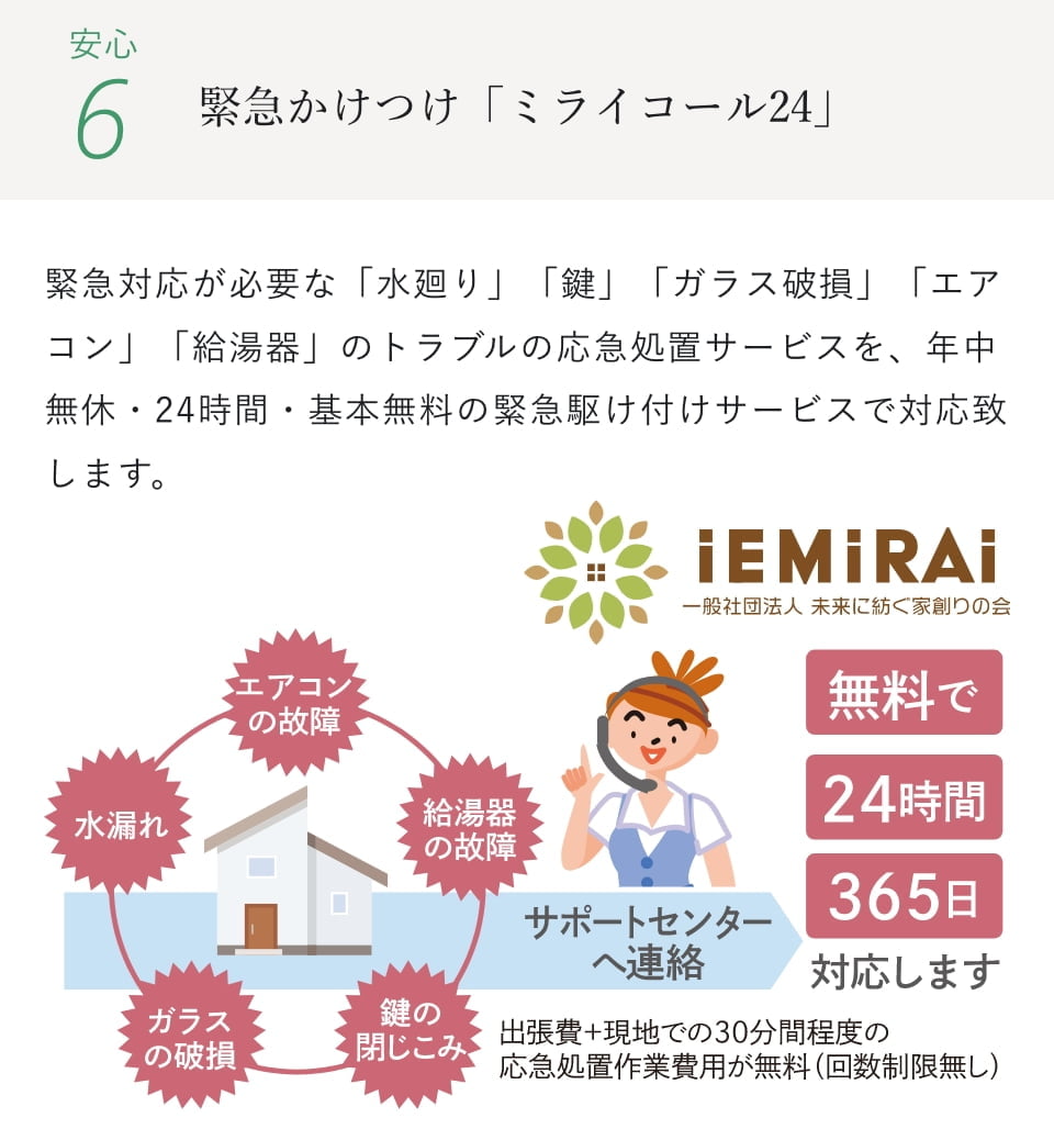 ※お引渡し後2年以降の点検は、5・10・15・20・25・30年になります。(5年ごとの点検には費用がかかります。)詳細につきましては、スタッフにお尋ねください。