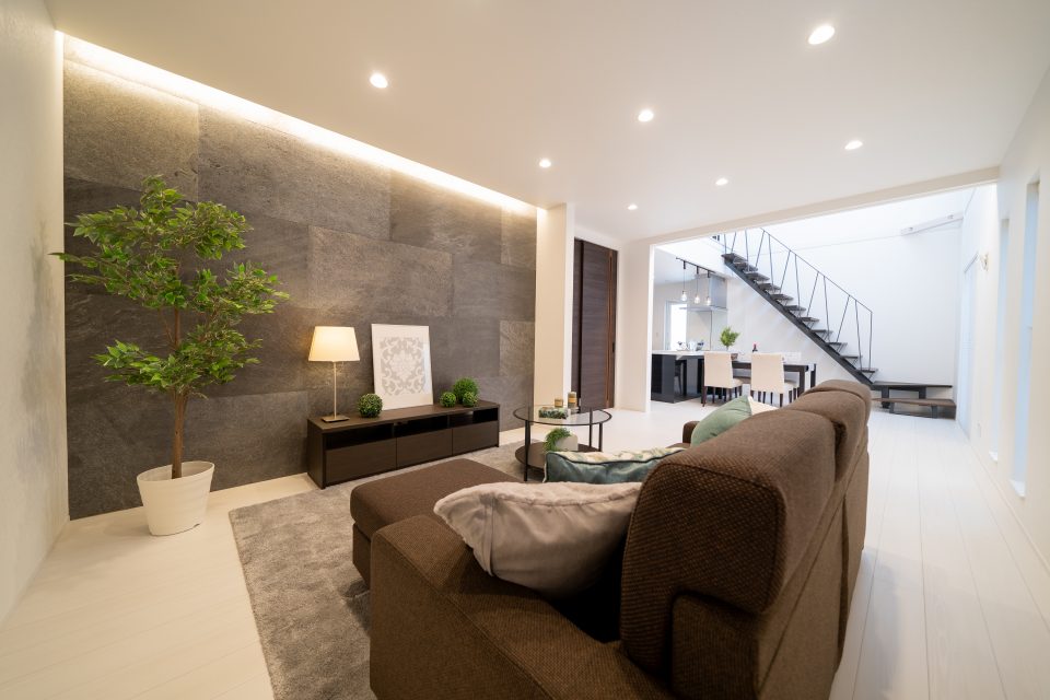 リビングの壁にはお施主様こだわりの天然の石を採用!