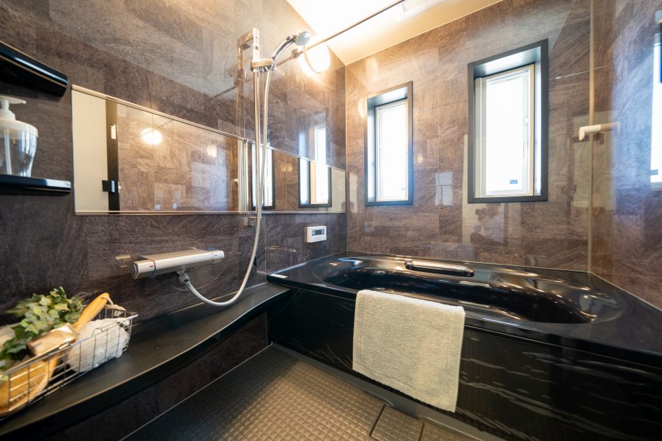 ブラック調の全面パネル一度入ってみたくなるユニットバス