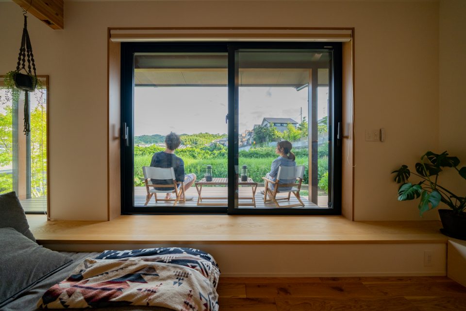 ソファの配置・水回りの動線・借景へのアプローチ・和室の小上がりスペース