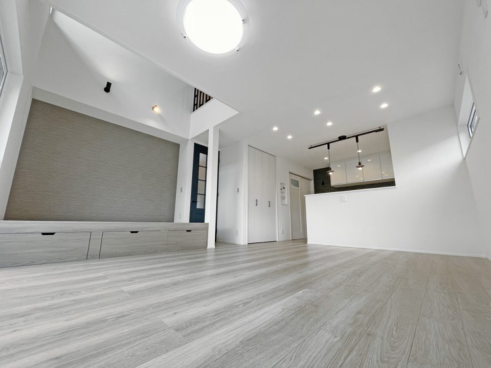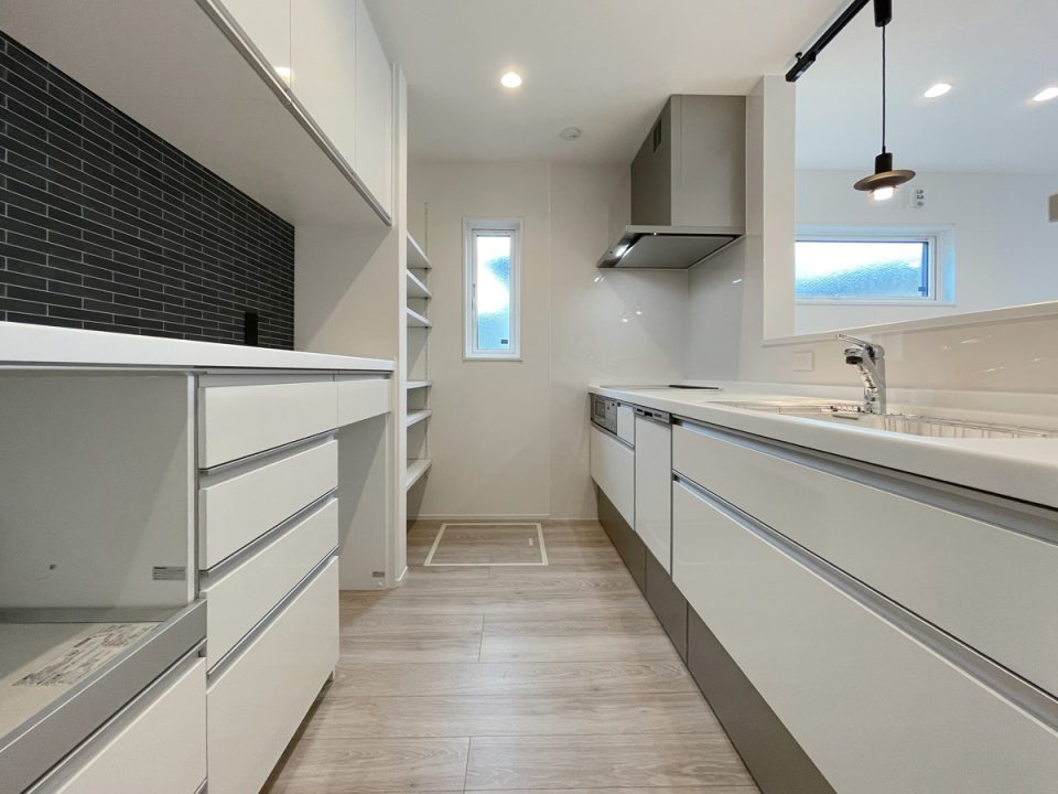 リビングと壁で仕切られていない、開放感のある対面キッチン。子供たちと会話を楽しみながら作業ができます。