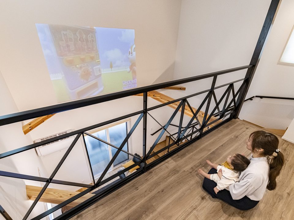 インナーバルコニーから吹き抜けの壁に投影し、お家でも大画面で映画が楽しめます。