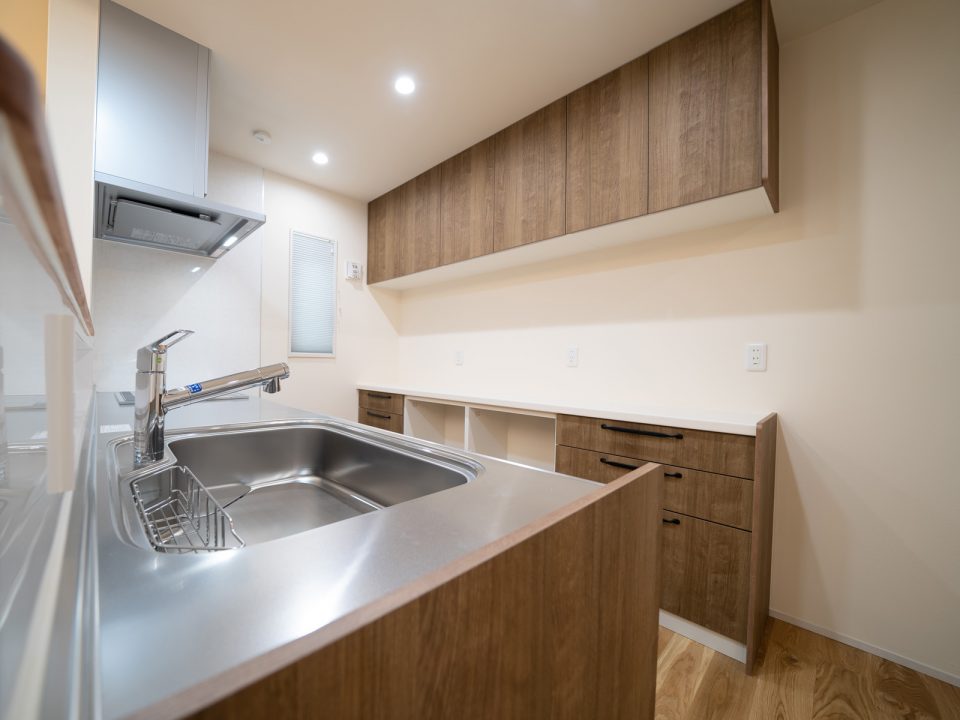 リビングと壁で仕切られていない、開放感のある対面キッチン。子供たちと会話を楽しみながら作業ができます。