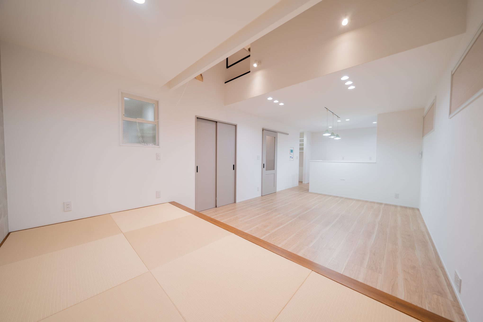 リビングに小上がりの畳を設けました。上を見ると吹抜けも設けているので開放感があります。