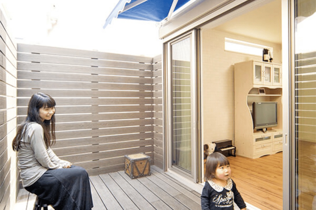 こだわりのカフェテラスは、プライベートバルコニーを濃い目のウッドデッキとウッドフェンスで囲い、採光を取入れながらプライバシーを確保できるというしくみです。さらに、ルーフシェードをつければプライベートのテラスとなる。濃い目のブラウンとルーフシェードのブルーがマッチしていてとてもオシャレです。
