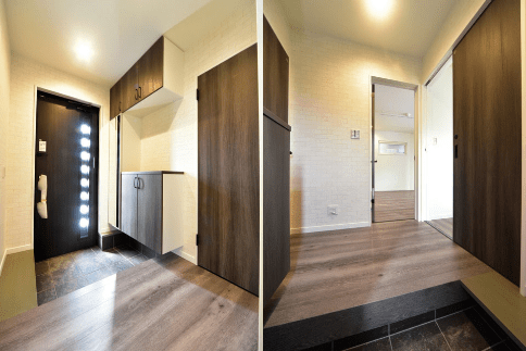 玄関ホールは落ち着いた雰囲気。シューズボックスの反対側には腰掛けるスペースもあり、小さな子供やおじいいちゃん、おばあちゃんにも使いやすい。