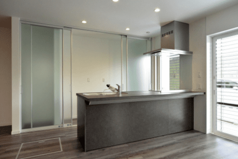 家電や食器を使う時だけ開閉するので、リビングをスッキリ見せます。カウンターキッチンのコンロカバーも透明で、まるでいお店のシェフになったよう。