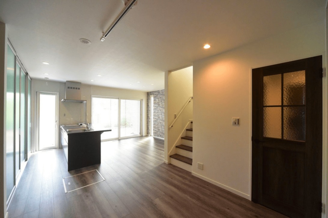 シックな雰囲気と一味変えてオールドスタイルの扉となっているLDK、リビング階段で2階へ続き、先ほどの存在感のあるキッチンスペースや対面にはストーン調の壁紙を配置されたダイニング。