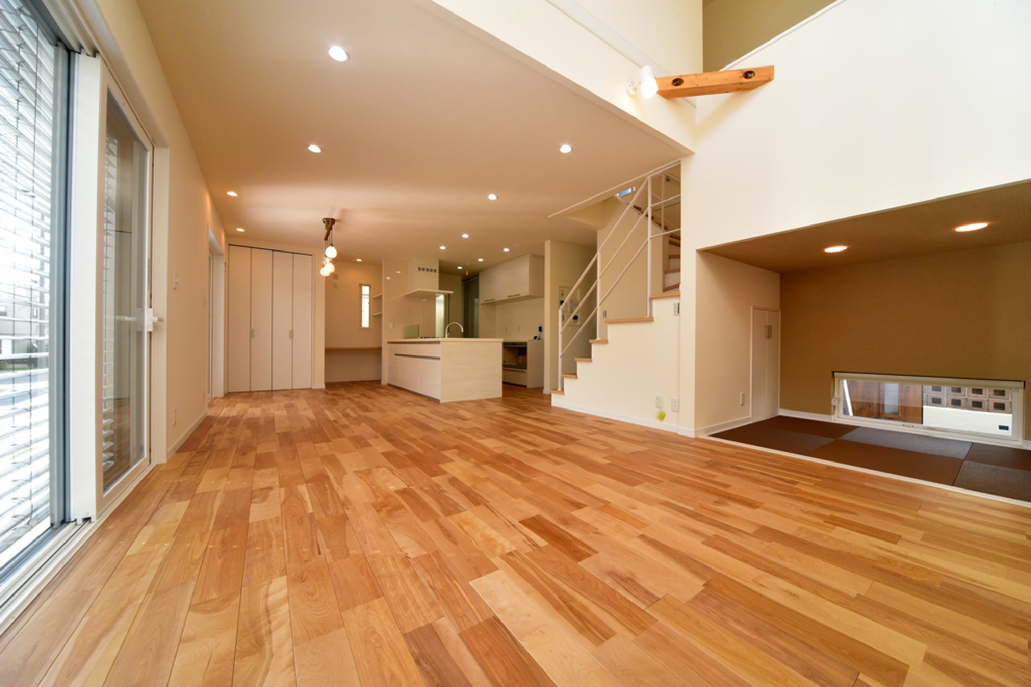 無垢材を使用した広いリビングは小部屋の畳スペースも含め開放的な空間になっています。