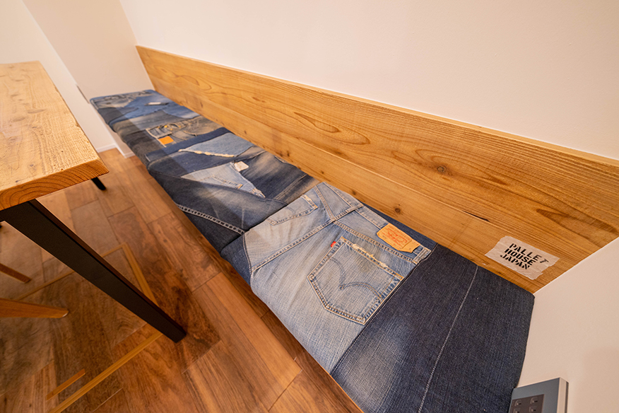 みんなのジーパンを持ち寄り(設計士・営業・現場監督・大工・お施主様)特注で椅子を作成